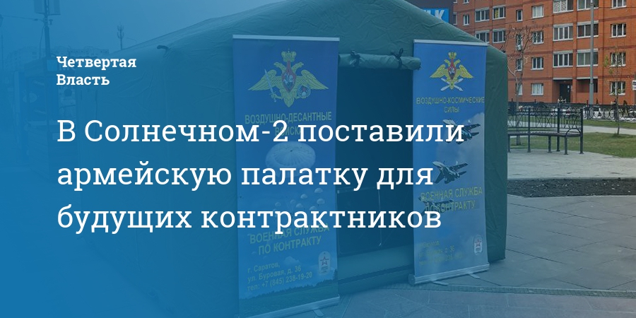 Судя по фотографии, палатка появилась на одной из аллей Солнечного-2 (проспект Героев Отечества). На входе размещены баннеры с адресом и контактами военного комиссариата Саратовской области. Внутри сидит представитель комиссариата, который помогает всем желающем узнать все подробности о службе по контракту.
