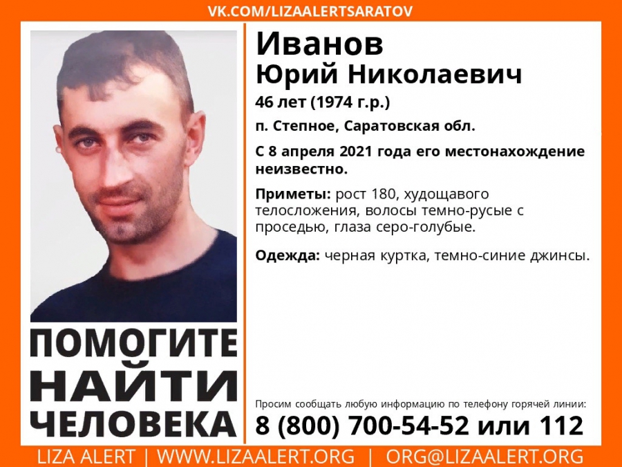 В Советском районе Саратовской области без вести пропал 46-летний Юрий Иванов. Об этом сообщает поисковый отряд «Лиза Алерт».