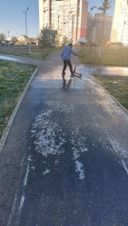 Горожане обнаружили, что тротуар благодаря «своевременному» поливу стал похож на импровизированный каток. Этими дорожками, в частности, пользуются дети, которые идут в школу или в детсад.