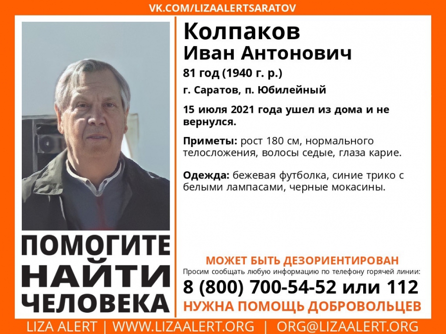 Сейчас волонтеры занимаются поиском на местности с соблюдением правил индивидуальной защиты. Если у вас есть информация о том, где находится Иван Колпаков, просьба позвонить по телефону: 8-800-700-54-52 или 112.