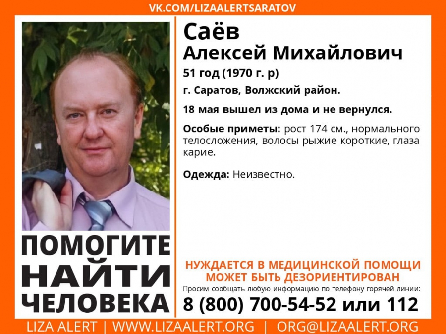 В Волжском районе Саратова без вести пропал 51-летний Алексей Саев. Об этом рассказали волонтеры поискового отряда «Лиза Алерт».