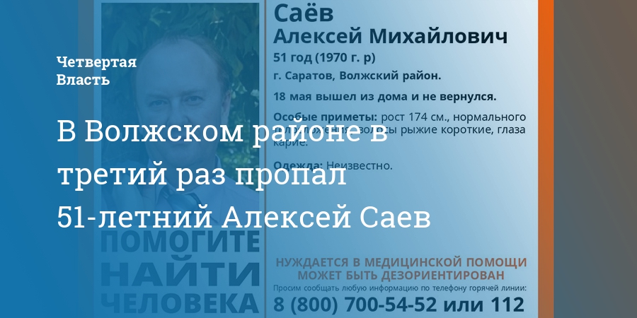 Отметим, Саев ранее пропадал как минимум дважды. Один раз это было 21 мая 2019 года. Тогда спустя несколько дней, 27 мая, его разыскали. Другой случай произошел в октябре того же года. Мужчину искали с 23 по 30 число.