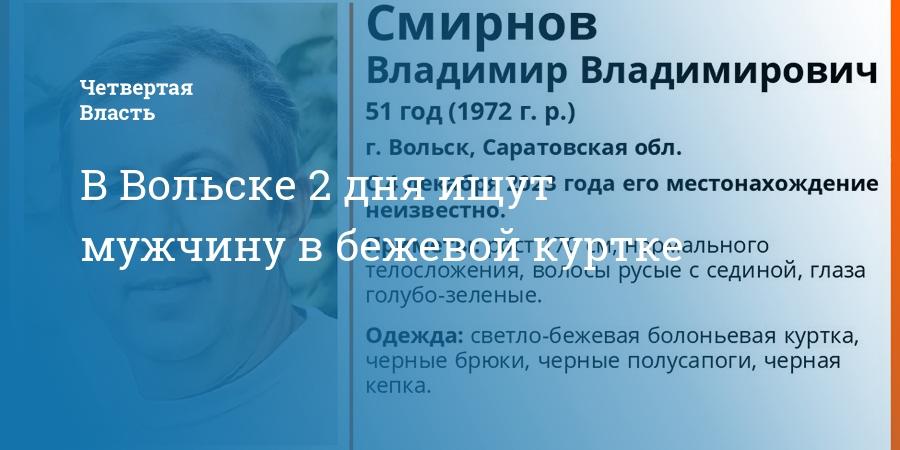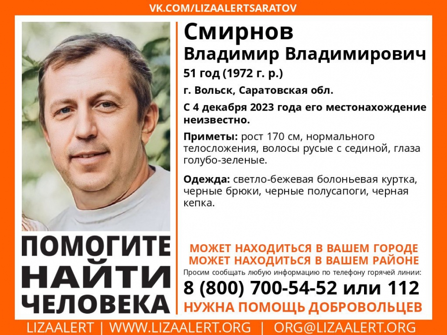 В Вольске Саратовской области без вести пропал 51-летний Владимир Смирнов. Об этом сообщили сегодня, 6 декабря, в соцсетях поискового отряда «ЛизаАлерт».