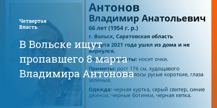 Указано, что Владимир Анатольевич исчез 8 марта – в Международный женский день. При каких обстоятельствах он пропал, не уточняется, лишь сказано, что «ушел из дома и не вернулся».