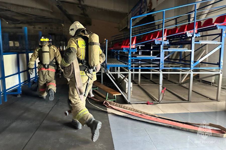 Всех находящихся внутри Ледового дворца эвакуировали, за исключением двух человек. По замыслу учений они оказались заблокированы внутри помещения. На их спасение направилось звено газодымозащитной службы.