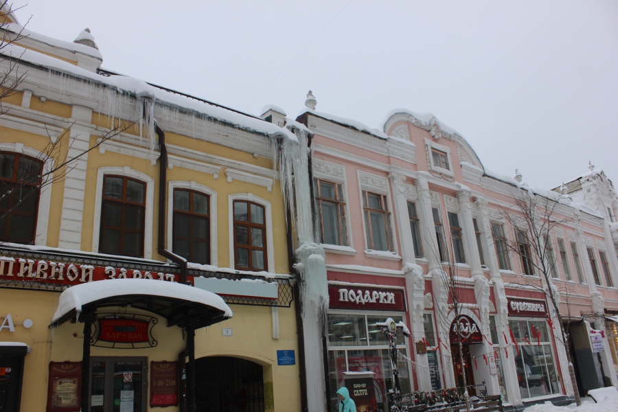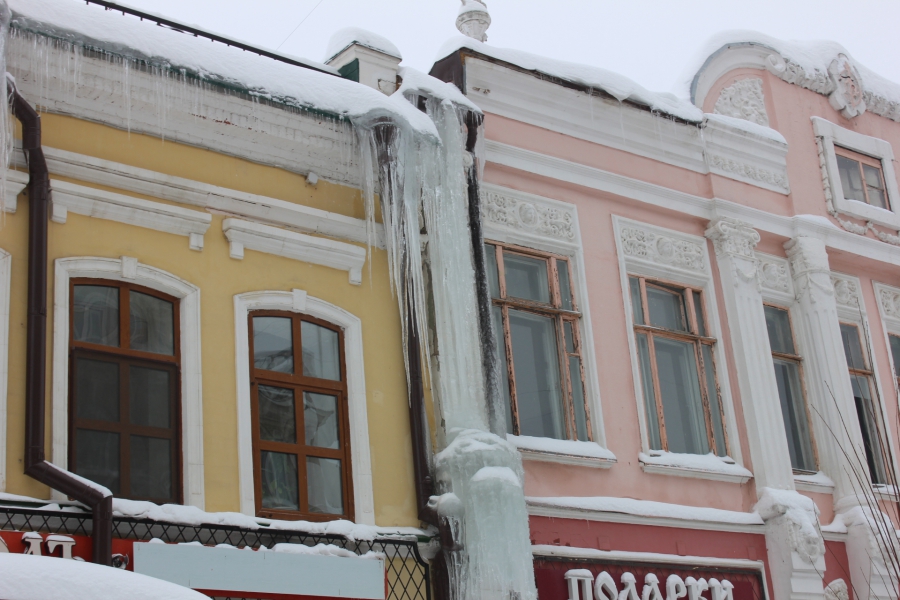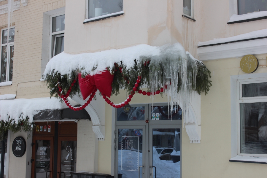 На Волжской на старых двухэтажных зданиях, в которых сейчас находятся кофейни и салоны красоты тоже намерзли ледяные глыбы. Сосульки намерзли и на новогодних декорациях.
