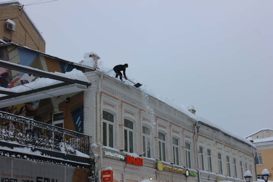 Справедливости ради, стоит отметить, что некоторые крыши все же там чистят. Например, на доме №23 на Волжской, в котором находятся кафе, как раз проходила уборка снега.