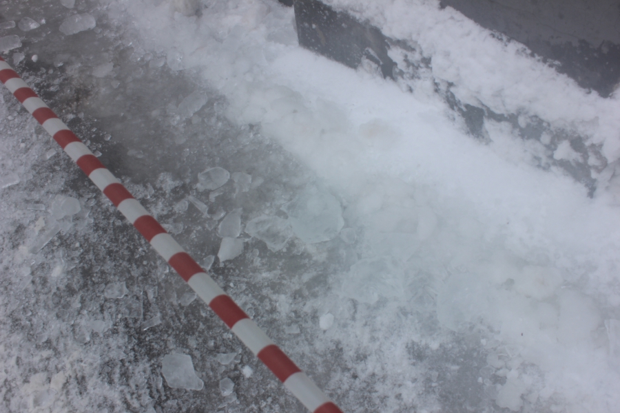 На проспекте Столыпина тоже местами можно увидеть обледенение. Как раз в тот момент с козырька конференц-центра Столыпина (дом №15) скидывали огромный ледяной нарост.