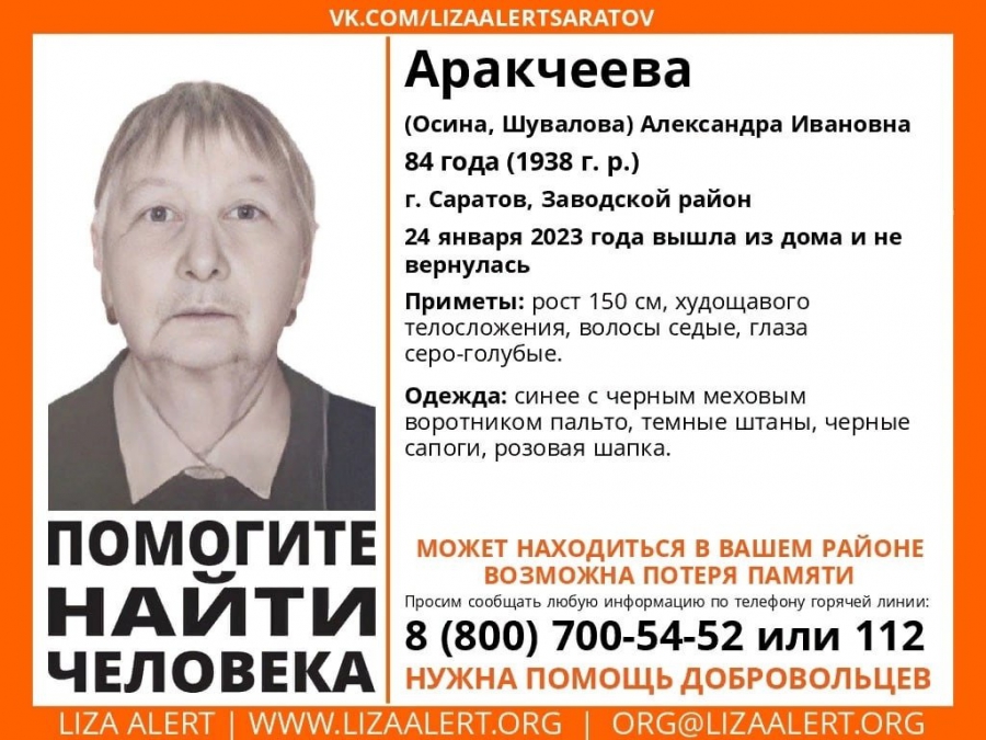 В Заводском районе Саратова ищут пропавшую без вести 84-летнюю Александру Аракчееву (Осину, Шувалову). Об этом сообщили сегодня в региональном штабе поискового отряда «Лиза Алерт».