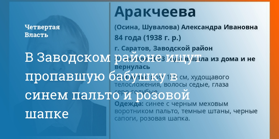 Вчера, 24 января, Александра Ивановна ушла из дома и не вернулась. По имеющимся сведениям, ее рост составляет 150 см. Она имеет худощавое телосложение, седые волосы и серо-голубые глаза. Последний раз ее видели в синем с черным меховым воротником пальто, темных штанах, черных сапогах и розовой шапке.