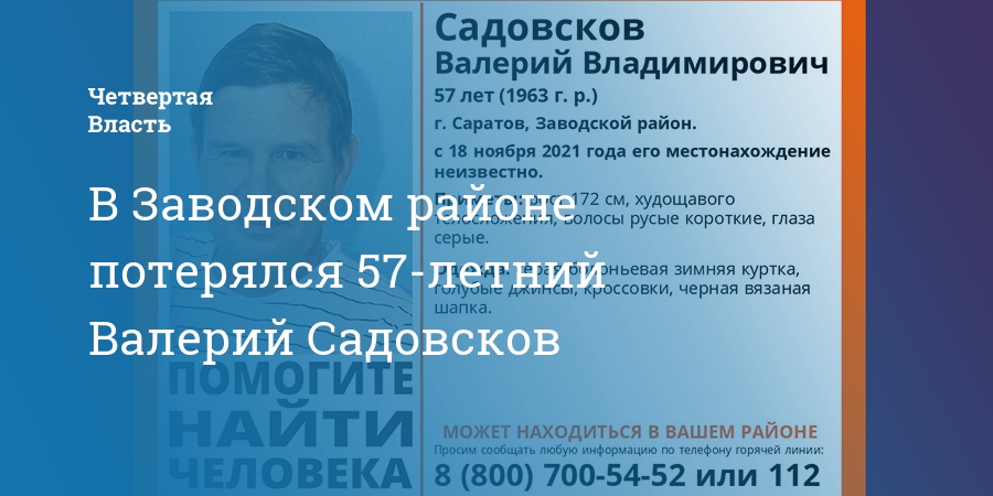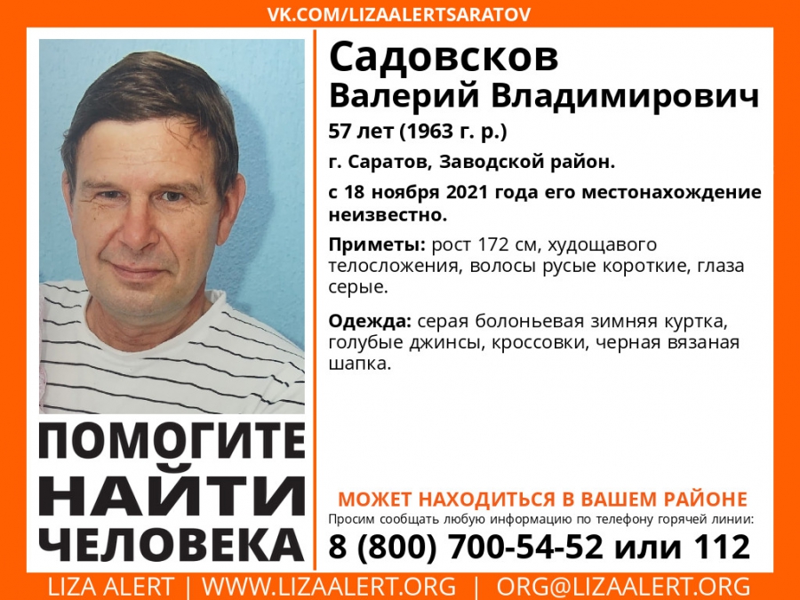 В Заводском районе Саратова потерялся 57-летний Валерий Садовсков. Об этом сообщает поисковый отряд «Лиза Алерт».