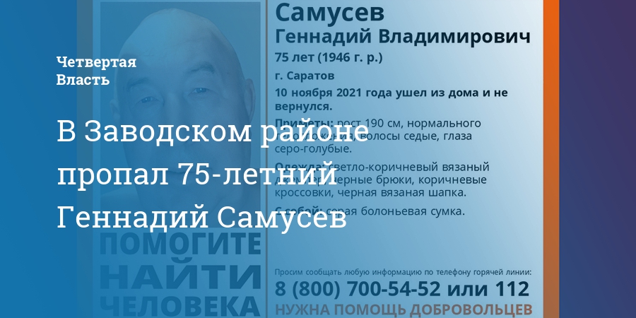 В Заводском районе Саратова без вести пропал 75-летний Геннадий Самусев. Об этом сообщили поисковики отряда «Лиза Алерт».