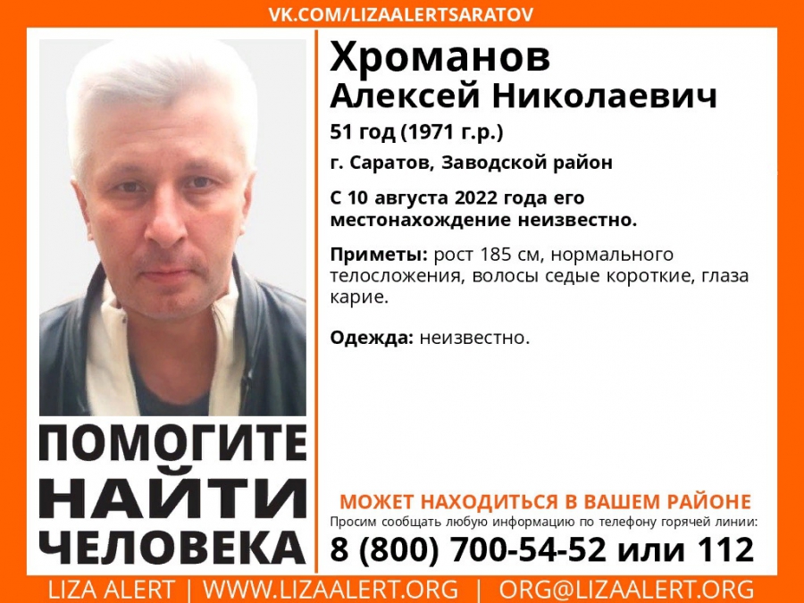 Всех, кому что-либо известно о Хроманове, просят обращаться по номеру 112 или по телефону «Лиза Алерт» 8-800-700-54-52.
