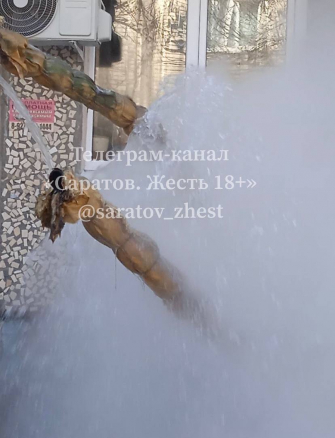По кадрам с места видно, что вода бесперебойно льется из разорванного трубопровода как на дорогу, так и на придомовую территорию. Отметим, что при этом видны клубы пара.