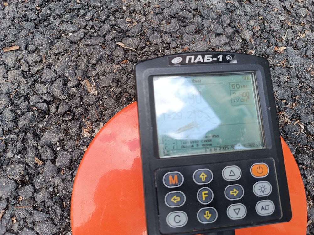 Также на проезде, в кармане у 2-го подъезда был обнаружен участок, на котором неразрушающий покрытие плотномер показал коэффициент уплотнения 0,90, что ниже нормативного требования. На данном участке хорошо заметна сегрегация покрытия, но выкрашивания и вызванного им разрушения пока не наблюдается.