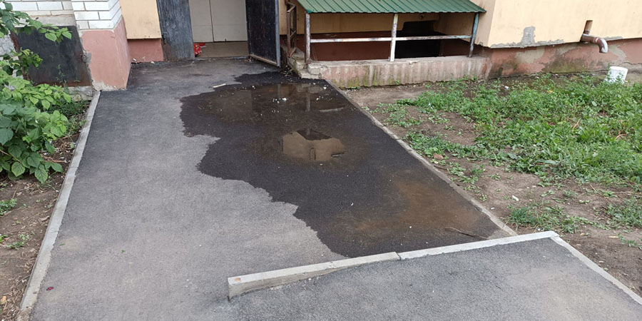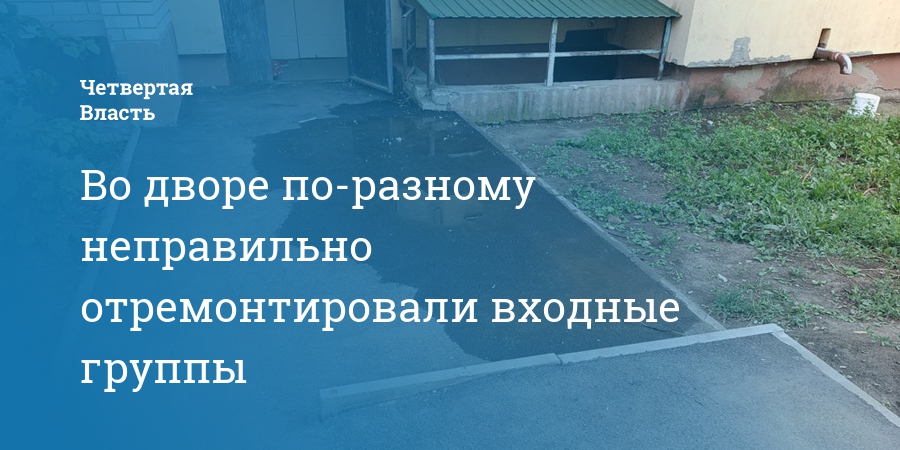 У одной входной группы не обеспечена ровность покрытия и водоотведение, из-за чего на ней стоят лужи. На другой был сооружен приступок из тротуарного бордюра, однако обустроить зону пандусом или хотя бы занизить борт до положенных по нормативу 1,5 см подрядчик не догадался. Ничего для удобства маломобильных групп граждан здесь сделано не было.