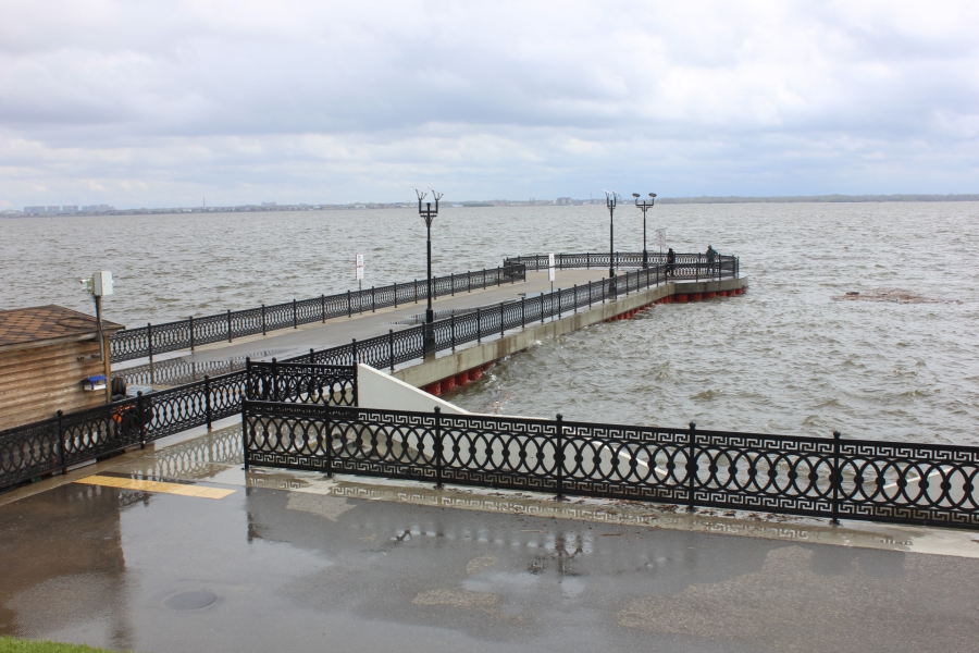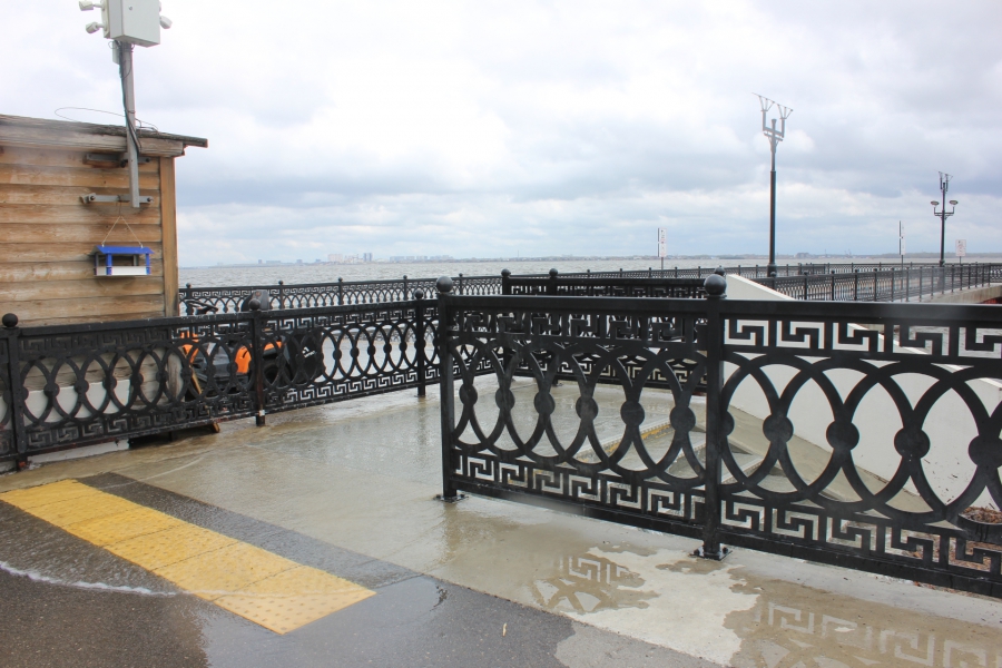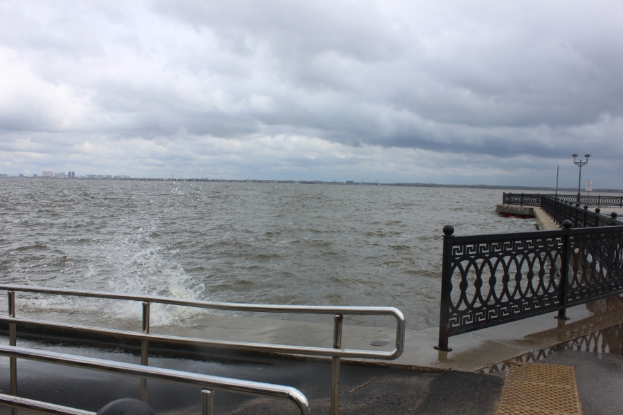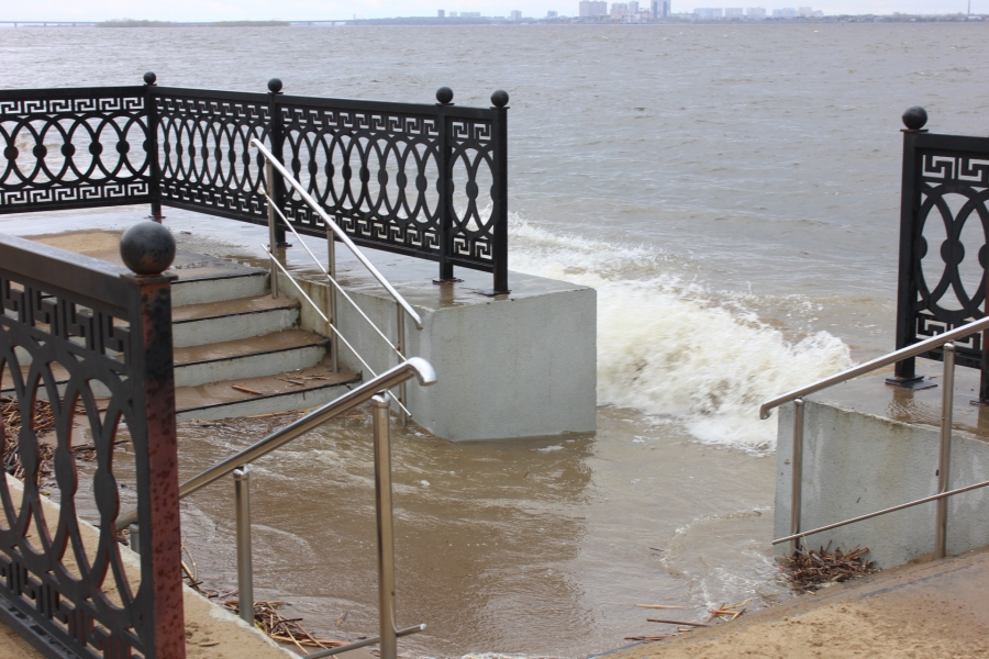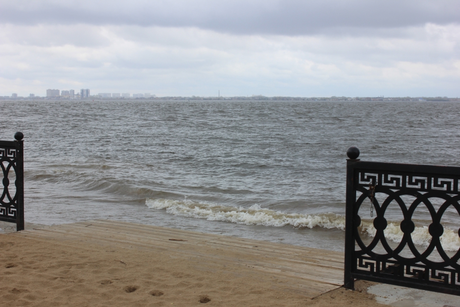 Сегодня из-за ветреной и холодной погоды на Набережной Космонавтов разыгрался настоящий шторм. Волны поднимались выше линии ограждений и затапливали нижний ярус. На территории Пляжа Покорителей Волги большая часть спусков к реке также оказалась залита водой.