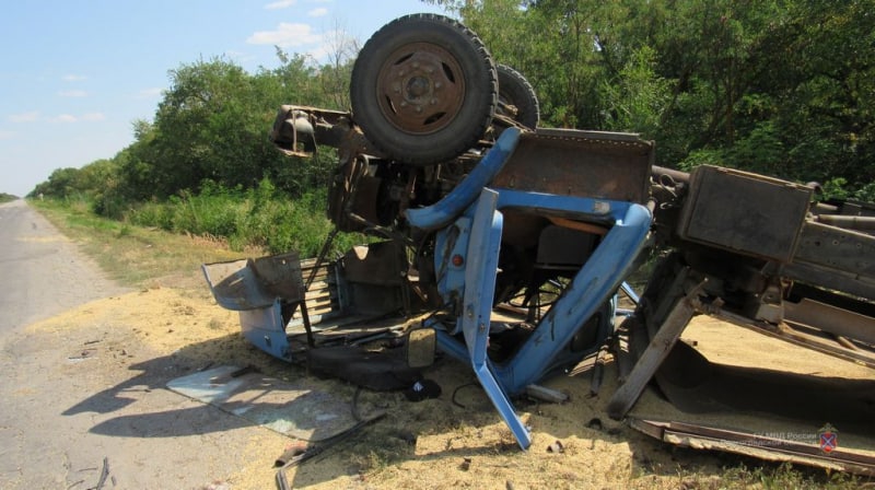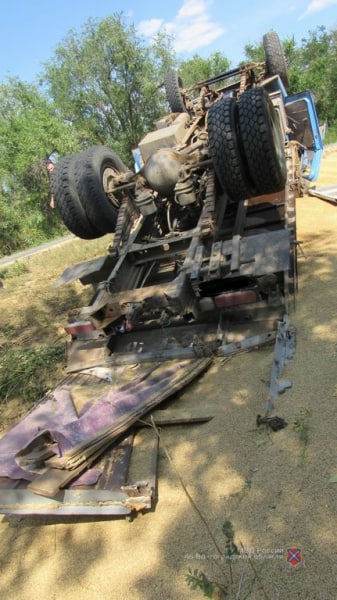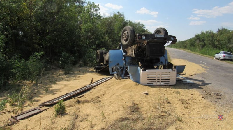 Волгоградец на угнанном грузовике с зерном перевернулся в Саратовской области