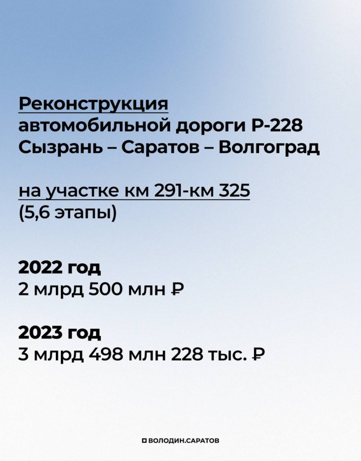 По его словам, утверждено выделение дополнительного финансирования на эти цели. Так, деньги пойдут на завершение реконструкции объездной дороги Саратова с 4-полосным движением (от Сторожевской развязки до Волгоградской).