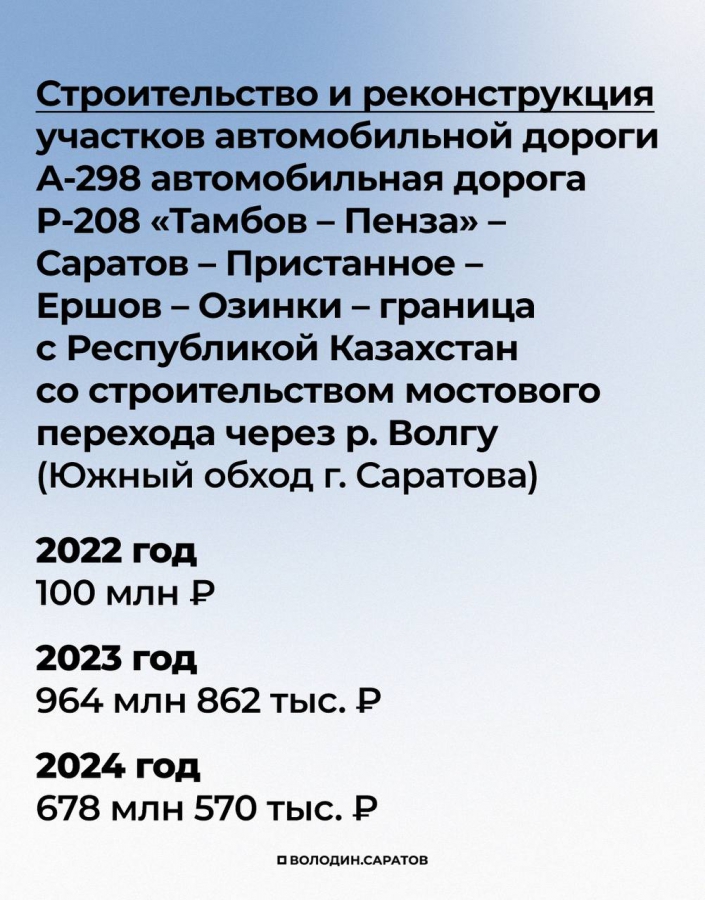 Кроме того, предусмотрены средства на проектно-изыскательные работы по строительству Южного обхода Саратова. Предполагается, что в рамках проекта будет построен новый мостовой переход через Волгу.