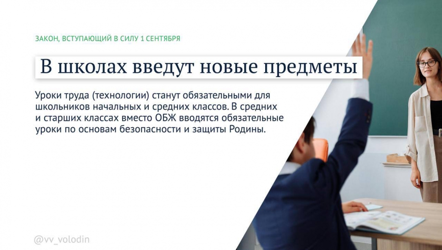 С нового учебного года в школах станут обязательными уроки труда, а вместо ОБЖ (основы безопасности жизнедеятельности) появится предмет «Основы безопасности и защиты Родины». Кроме того, во всех образовательных учреждениях (детсады, школы, техникумы, вузы) будут вывешивать флаг России.