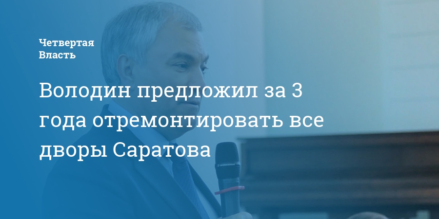 Вячеслав Володин пообещал каждый год на ремонт дворов Саратова находить миллиард рублей, остальные деньги должны найти администрация города и правительство. Таким образом, по оценке политика, все дворы города получится привести в порядок за 3 года.