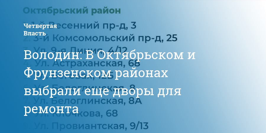 Перечисленные в карточках территории отремонтируют в рамках второго этапа депутатского проекта «Ремонт дворов». Всего в списках 11 дворов в Октябрьском районе и 3 - во Фрунзенском.
