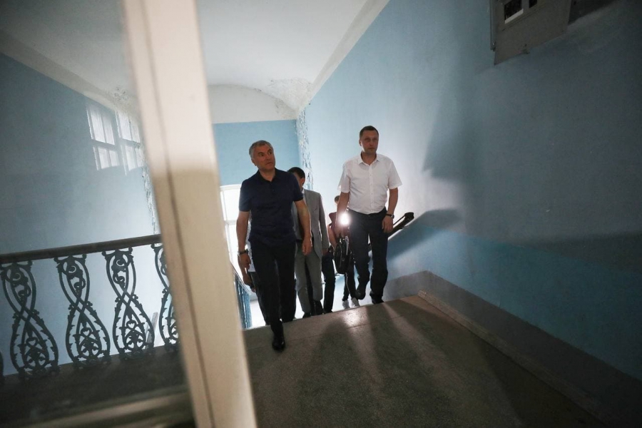 Глава Госдумы обратил внимание на огромную трещину в стене. По его словам, мэрия и правительство области «сюда даже не подходили».