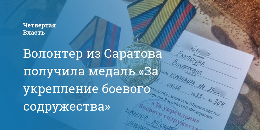 Волонтер из Саратова по имени Екатерина, которая помогает в информировании семей участников специальной военной операции, получила медаль «За укрепление боевого содружества». Об этом сообщили в телеграм-канале «Твои Герои, Саратов! ZOV», курируемом депутатом областной думы, Героем России Александром Янкловичем.