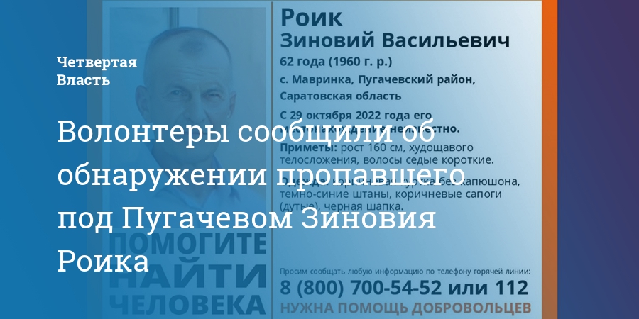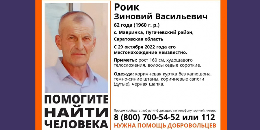 Пропавший в Пугачевском районе Саратовской области 62-летний Зиновий Роик найден живым. Об этом сообщили волонтеры отряда «Лиза Алерт».