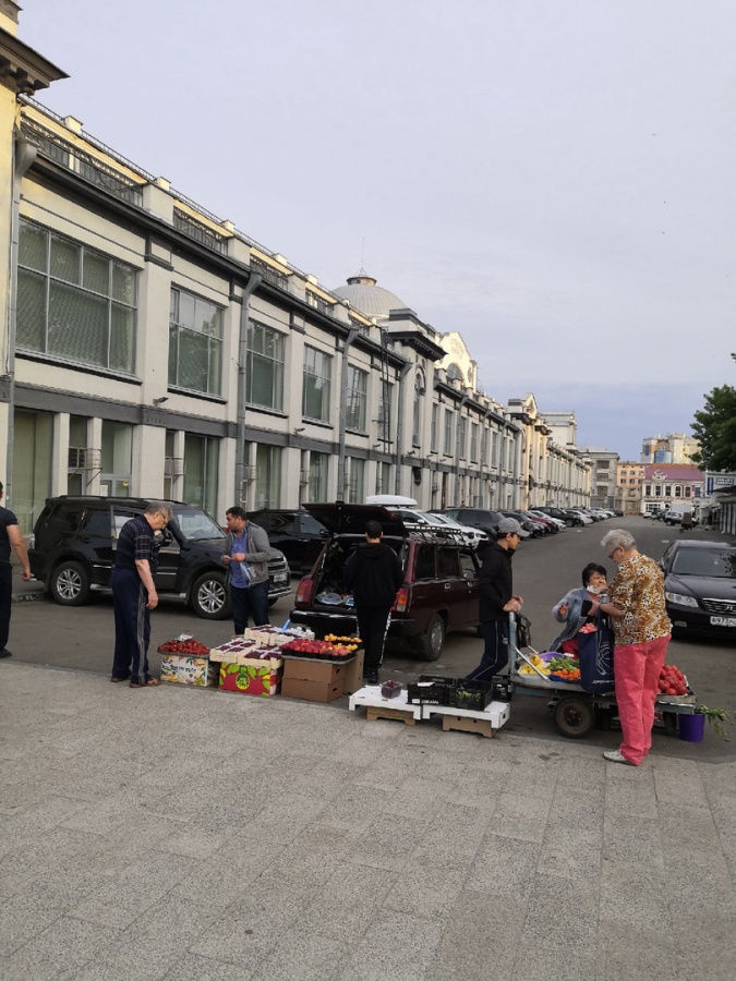 Судя по фото, с машин торгуют овощами и фруктами, вполне возможно, что это делают те же люди, что торговали здесь в свое время с лотков.