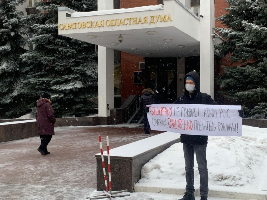 Сегодня возле здания Саратовской областной думы прошел одиночный пикет против депутата от КПРФ Николай Бондаренко. Активист держал в руках плакат с надписью «Бондаренко мошенник и вор! Вон из думы!».