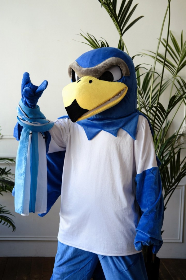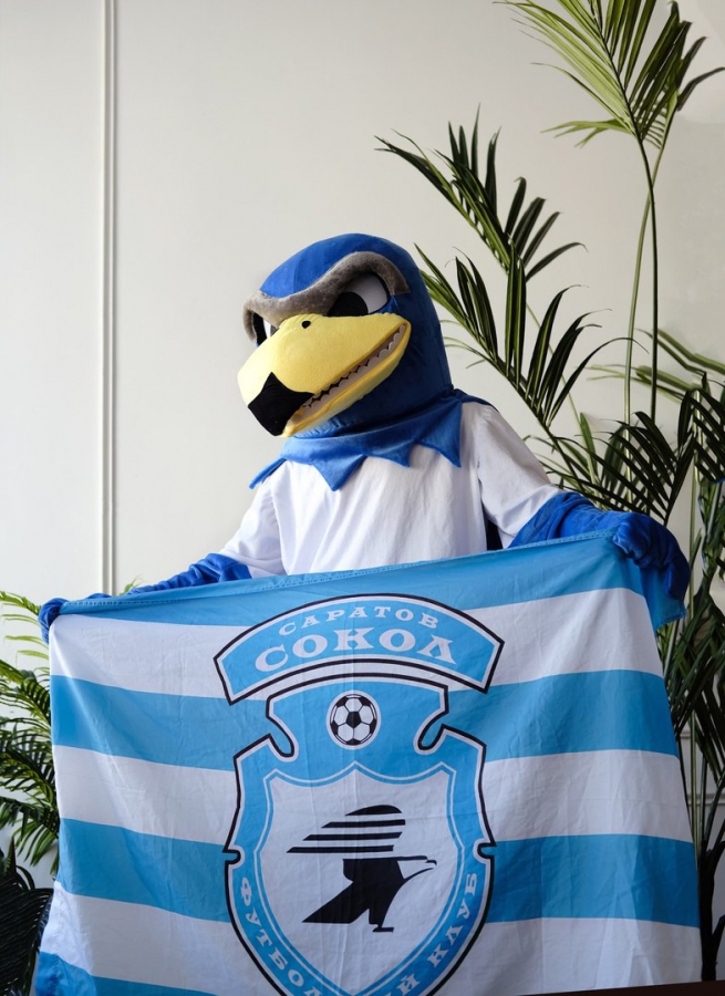 У саратовской футбольной команды «Сокол» появился новый талисман, и ему выбрали имя. Это бело-синяя птица с большим клювом и суровым взором (антропоморфный сокол).
