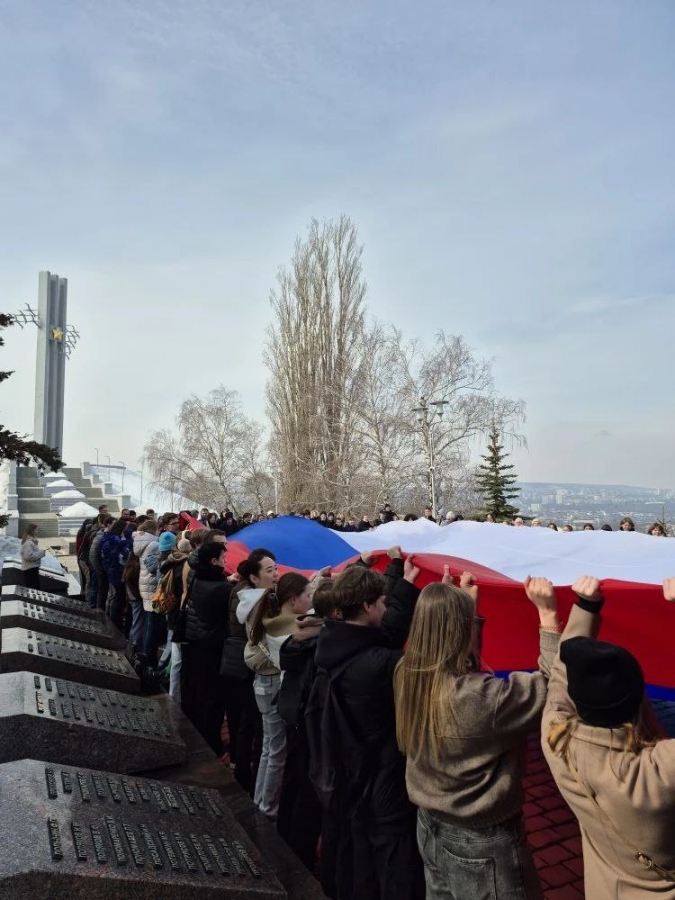 В Саратове в честь 12-й годовщины воссоединения с Крымом в Парке Победы у мемориального комплекса «Журавли» развернули 100-метровый российский флаг. Об этом сообщает пресс-служба министерства внутренней региональной и муниципальной политики.
