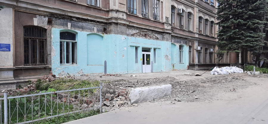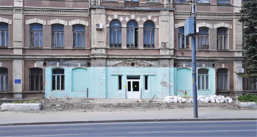 Судя по фото, у главного входа полностью убрали крыльцо, крышу, стеклянные стены, а также цветочные клумбы. Эта конструкция существовала более 50 лет со времен масштабной перестройки здания, когда число этажей выросло с двух до четырех.