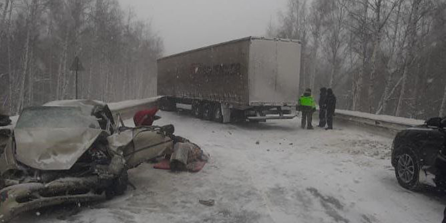 На фотографии с места происшествия видно, что легковой автомобиль сильно смяло от удара с фурой. Сам грузовик перекрыл большую часть дороги.