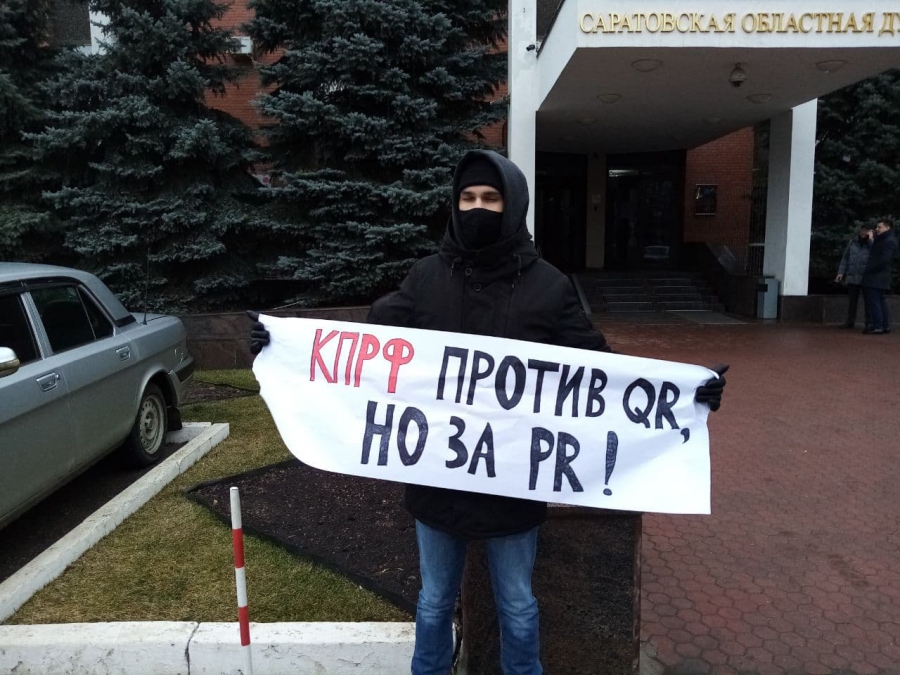 Один активист держал плакат с надписью «КПРФ, твоим членам идет роба!», другой – «КПРФ против QR!».