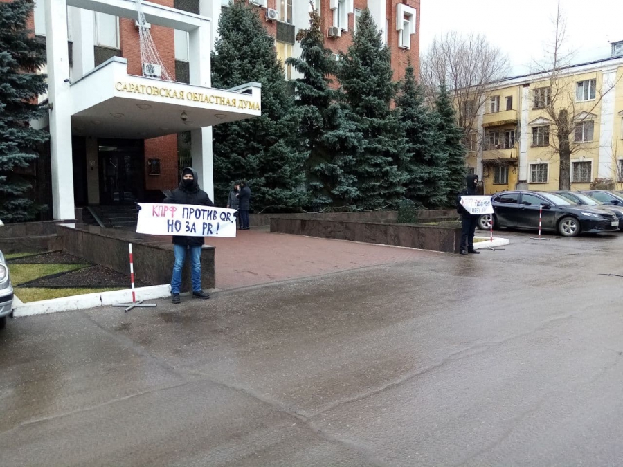 Сегодня перед заседанием Саратовской городской думы у стен регионального парламента устроили одиночные пикеты с критикой КПРФ.