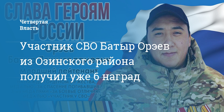 Младший лейтенант Батыр Орэев из Озинского района Саратовской области получил 6 наград в ходе проведения специальной военной операции. Об этом сообщила сегодня, 2 февраля, глава района Антонина Галяшкина в своем телеграм-канале.