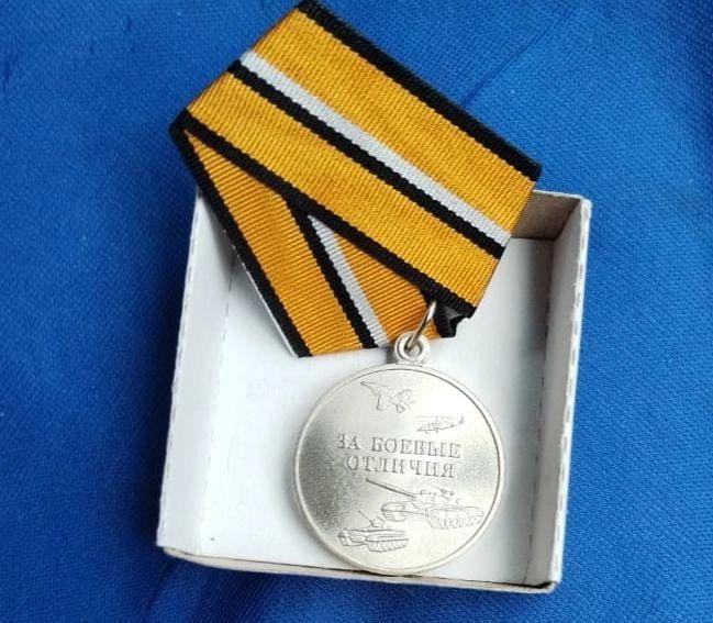 За проявленные на фронте отвагу и храбрость воина наградили ведомственным знаком отличия Министерства обороны РФ – медалью «За боевые отличия».