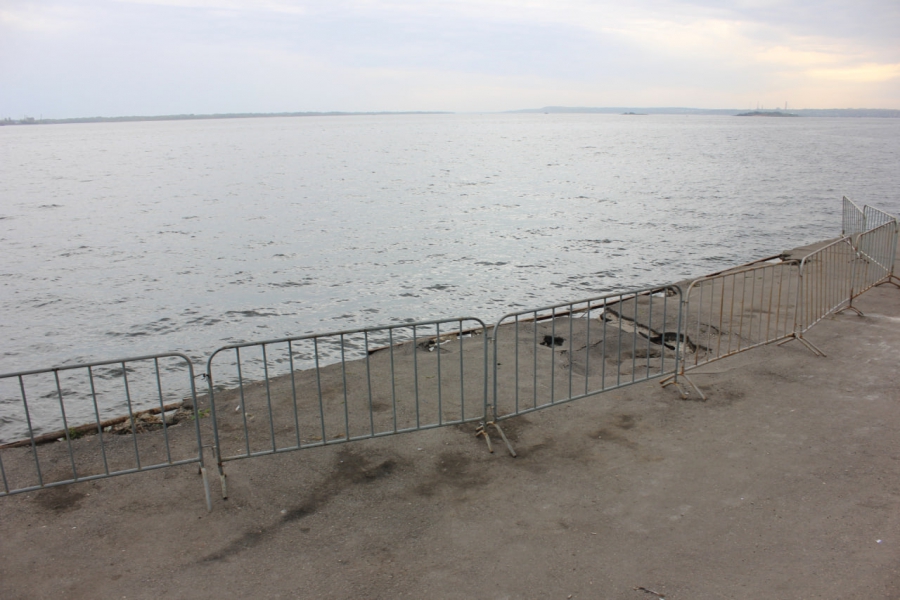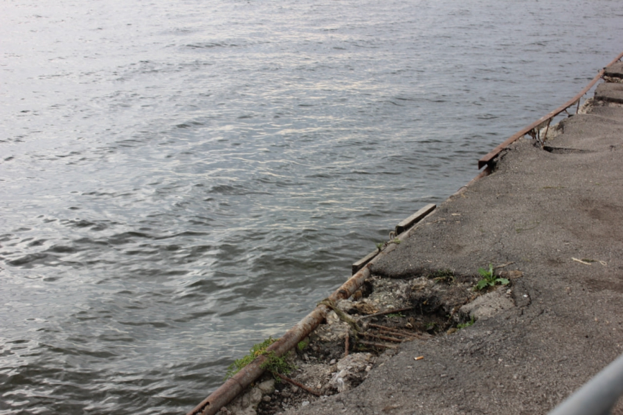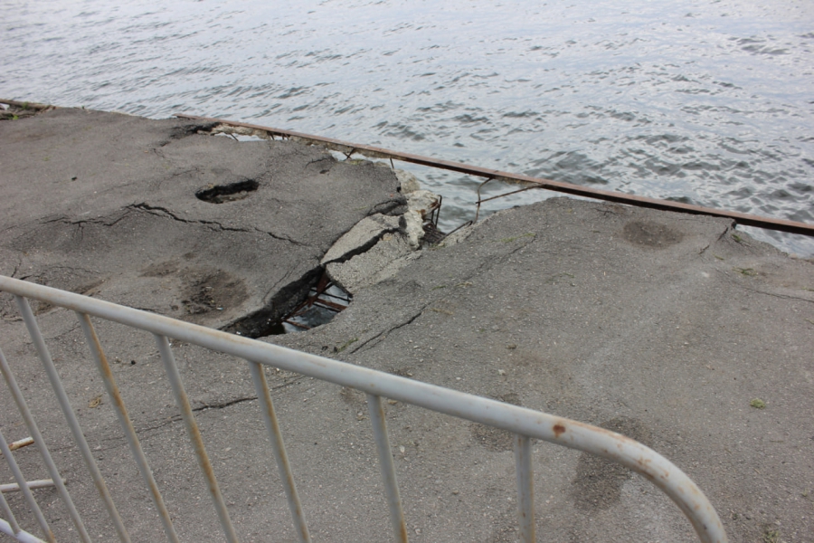 Аварийный участок образовался на нижнем ярусе, рядом с городской достопримечательностью – ротондой. Край набережной в этом месте представляет собой печальное зрелище: всюду наблюдаются дыры и трещины, этот участок в любой момент может обвалиться и уйти под воду. Там уже обнажились выбившиеся из конструкции металлические основания. Вероятно, в целях безопасности его огородили забором. Но это не мешает людям отдыхать неподалеку и купаться.