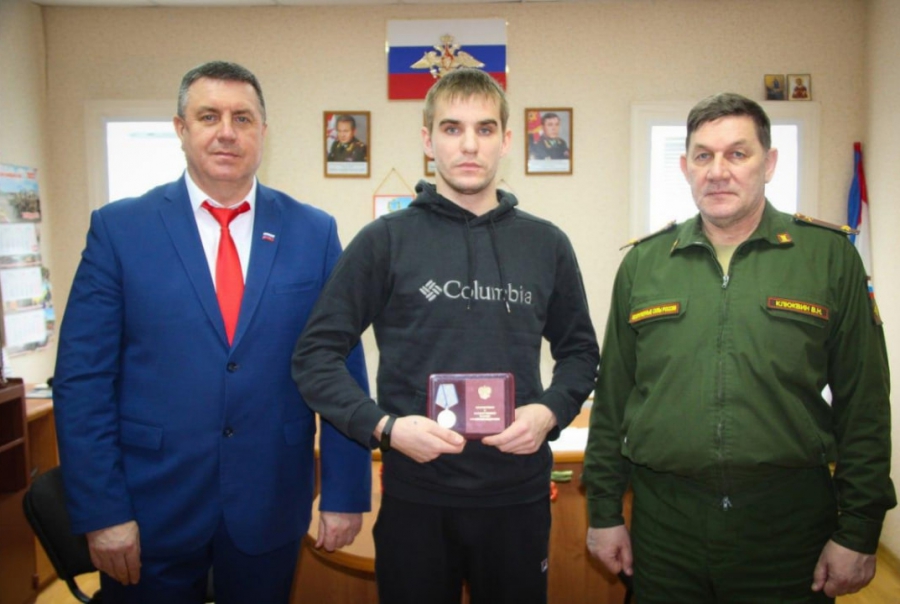 Вадиму Базылеву вручили медаль заместитель главы администрации района и исполняющий обязанности военного комиссариата родного района бойца.
