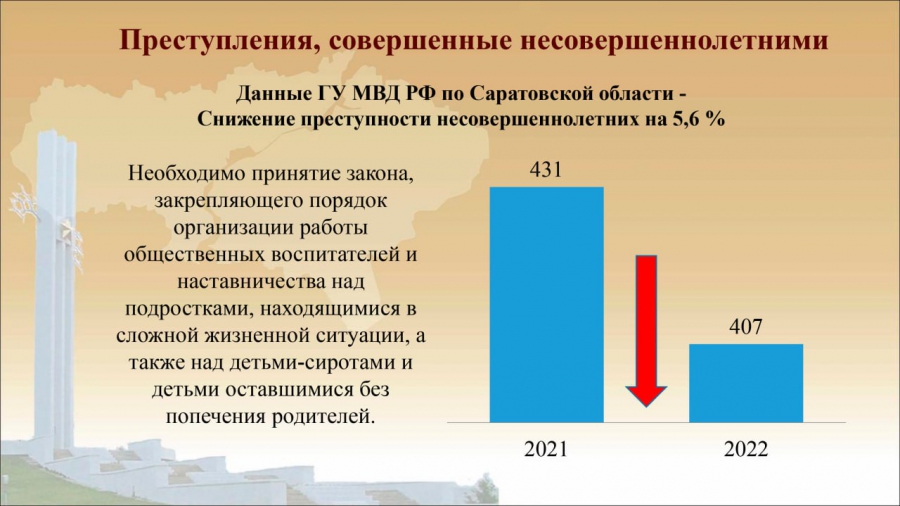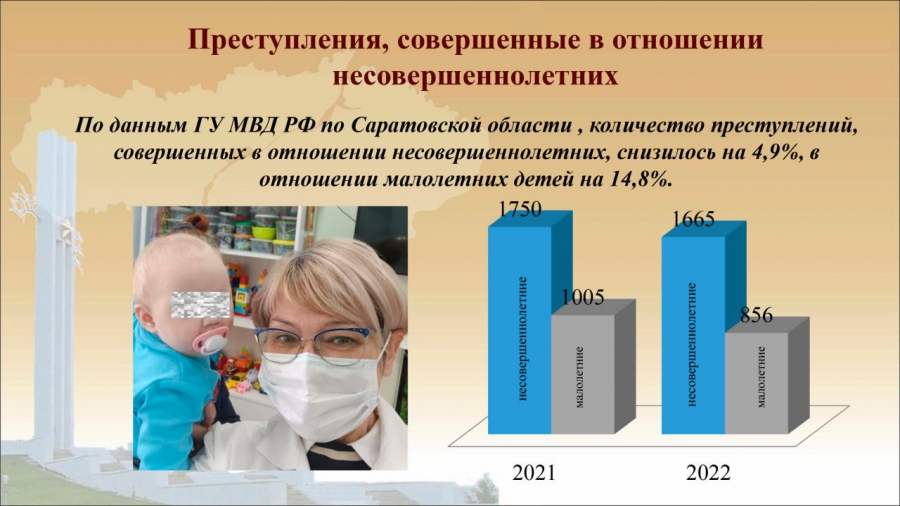 Загородняя в отчете отметила снижение в регионе уровня детской преступности. По данным регионального ГУ МВД, в прошлом году насчитывалось 407 преступлений с участием несовершеннолетних (в 2021 – 431). По словам уполномоченного, на 4,9% также уменьшилось число преступлений в отношении самих несовершеннолетних – 1665 эпизодов (за аналогичный период в 2021 году – 1750).