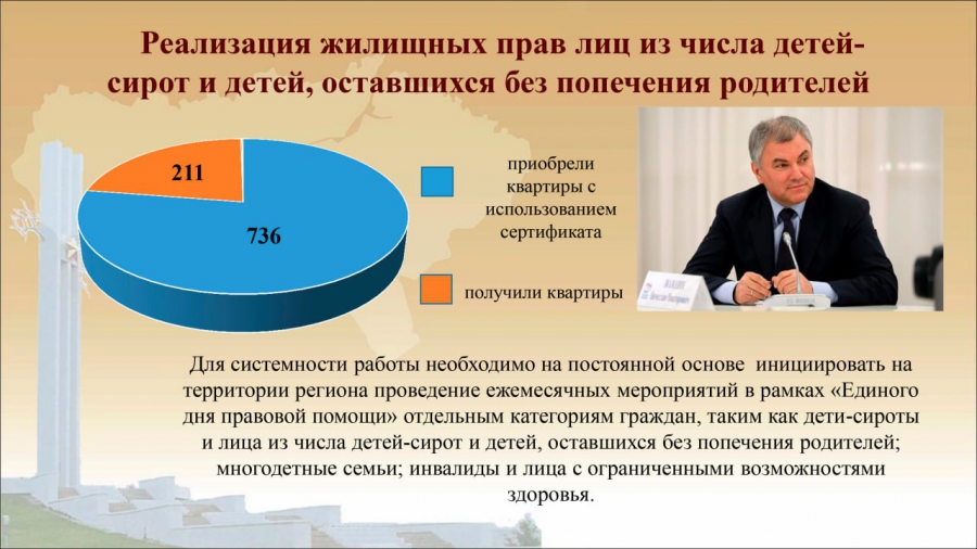 В данный момент жилищный сертификат на территории области дети-сироты могут получить с 21 года. Детский омбудсмен предложила снизить этот возраст. Свою позицию она объяснила тем, что к ней на прием часто приходят молодые мамы младше этого возраста. Они часто нуждаются в жилье, но не могут претендовать на него. Кроме того, Загородняя озвучила идею создания специальных гостиниц для семей сирот, которые уже имеют детей.