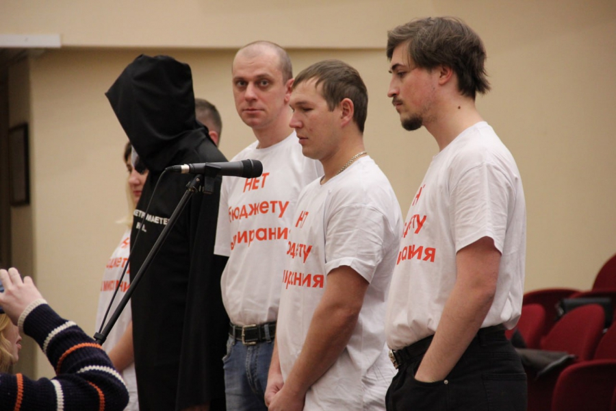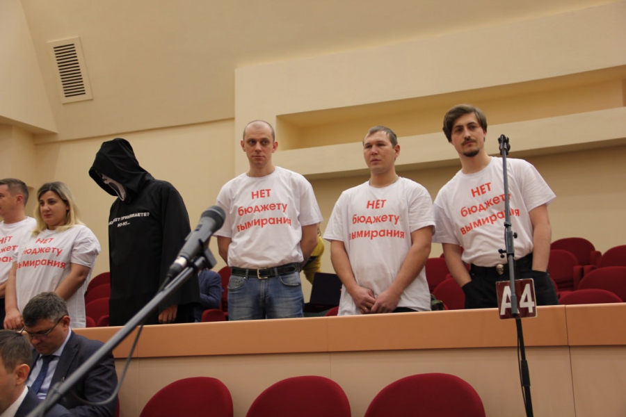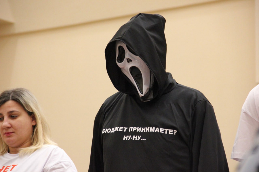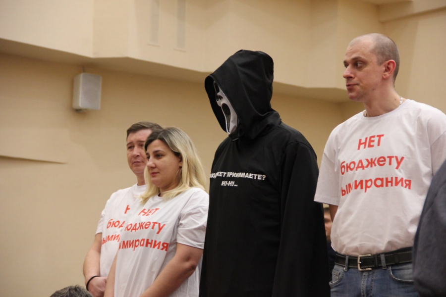Председатель комитета по финансам Александр Струков зачитывал проект бюджета на 2024 год, когда его выступление прервали люди в белых футболках с красной надписью «нет бюджету вымирания». Компанию возглавлял человек в костюме «смерти с косой». Все они встали в конце зала лицом к спикеру.