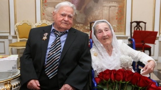 На торжественной церемонии в ЗАГСе Савельевы поставили подписи в книге чествований, поздравили друг друга юбилейным поцелуем