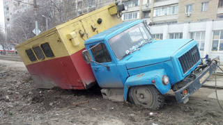 Сегодня ночью в Саратове на улице Антонова в яму провалилась бетономешалка на базе «МАЗа»