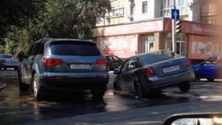 Сегодня утром в центре Саратова два автомобиля поочередно попали дорожную «ловушку», провалившись в яму